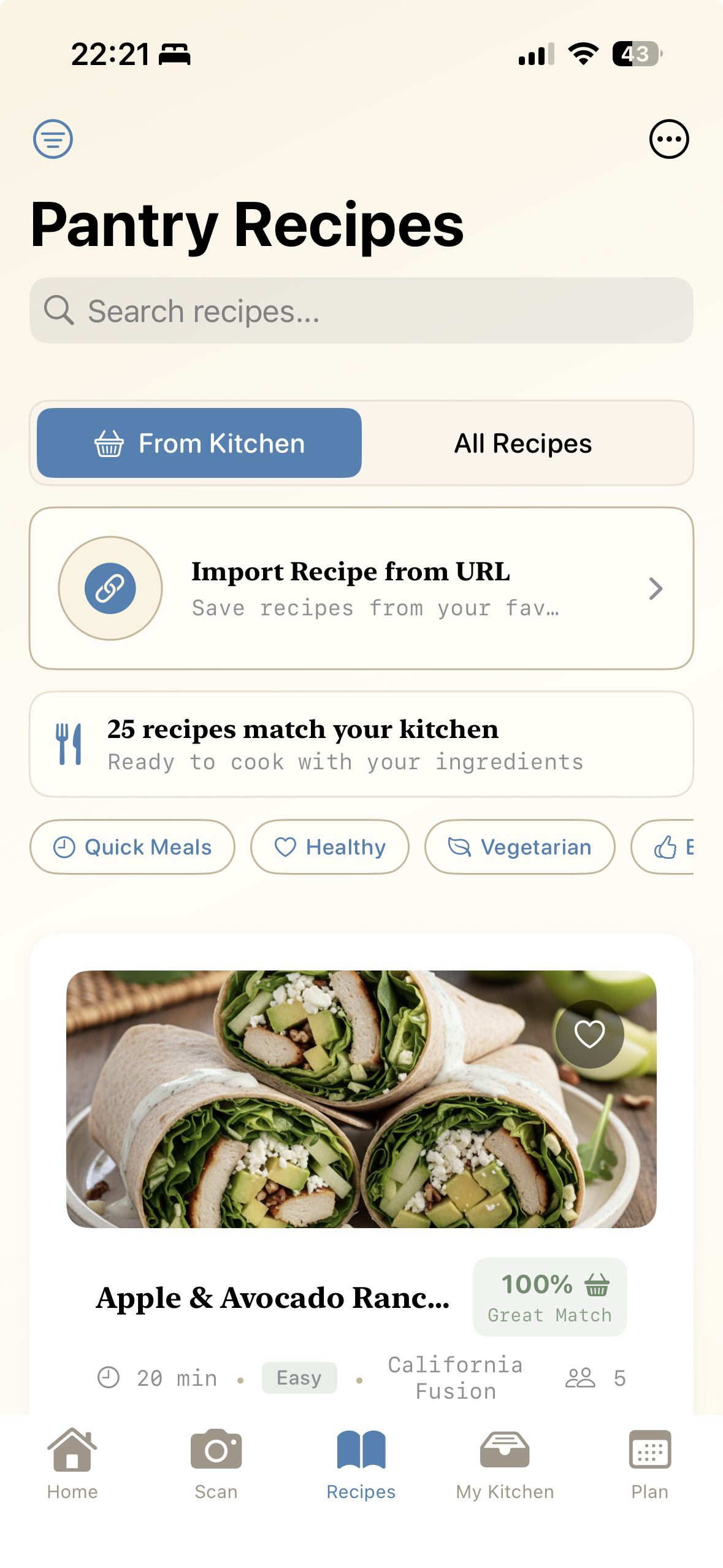No more "what's for dinner?" stress. Get recipes based on what you actually have, filtered by your time and dietary needs.