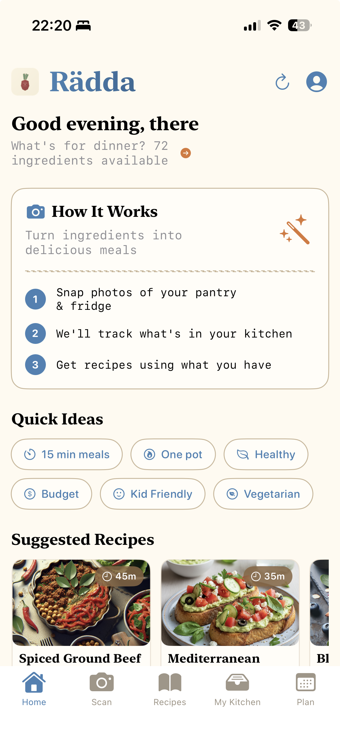 Snap your ingredients, get instant recipe ideas. Rädda helps busy households cook what's already in the fridge—before it goes to waste.